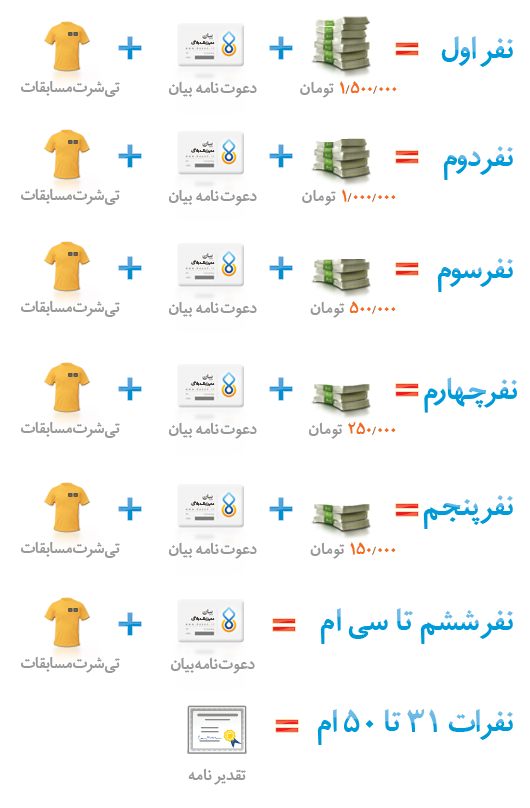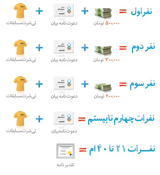 نفر اول : دعوت نامه عضویت در بلاگ بیان (blog.ir) و صندوق بیان (bayanbox.ir) + تی شرت مسابقات + ۵/۰۰۰/۰۰۰ ریال معادل پانصد هزار تومان